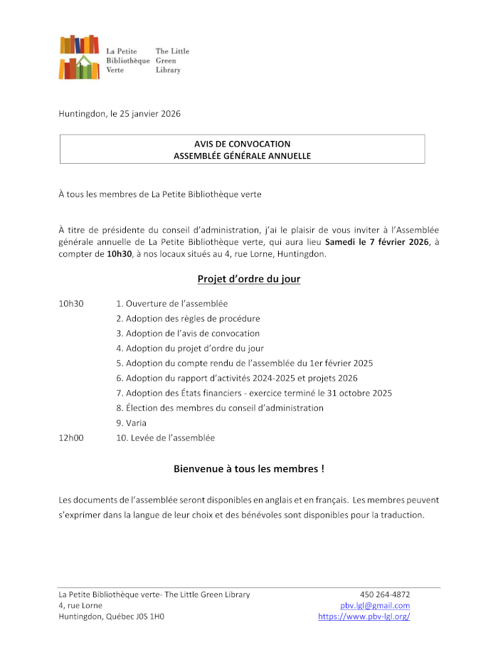 Assemblée Générale Annuelle 2026, Samedi 7 février à 10h30