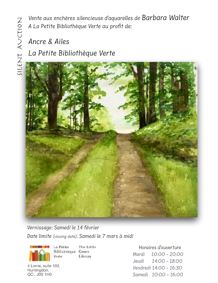Vernissage pour Barbara Walter. Samedi 14 février de 14h à 16h à la Petite Bibliothèque verte. Vente aux enchères silencieuse.